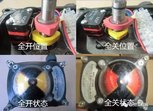 2. 打開回信器上蓋,檢查行程擋塊是否與閥門開關(guān)相對應(yīng)。閥門全開時黃色擋塊壓下開關(guān),閥門全關(guān)時紅色擋塊壓下開關(guān)。以及裝上蓋時,上蓋上的指示也要與閥門開關(guān)一至。